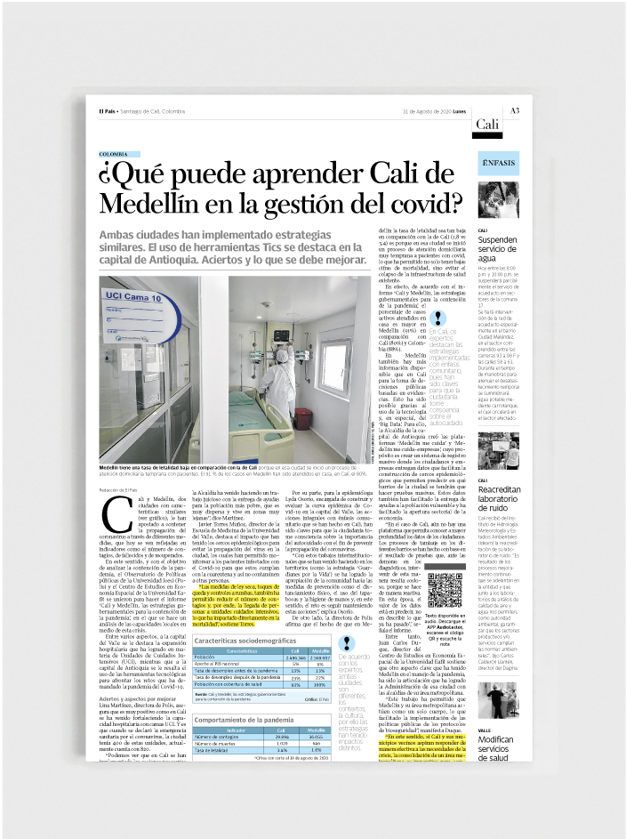 Entre los puntos que destacan a Cali, se pueden encontrar una rápida acción en expansión de capacidad hospitalaria y equipos de atención médica. Mientras que en la capital de Antioquia, se puede resaltar el uso efectivo de herramientas tecnológicas para un monitoreo en tiempo real de la pandemia.